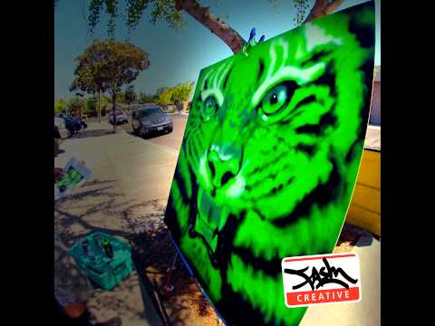 Graffiti muralist Fasm painting a green tiger with spray paint.